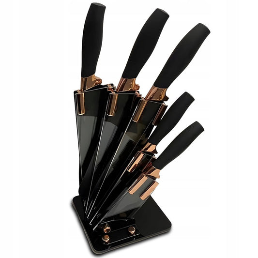 Zestaw 5 noży kuchennych w bloku - kompletny zestaw ostrych noży kuchennych, stojak czarny.