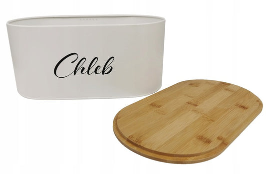 Duży chlebak - pojemnik na chleb z pokrywą, deską bambusową, stalowy, biały.