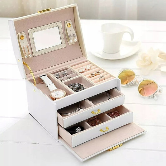 Kuferek szkatułka organizer na biżuterię – biały, z lusterkiem i kluczykiem