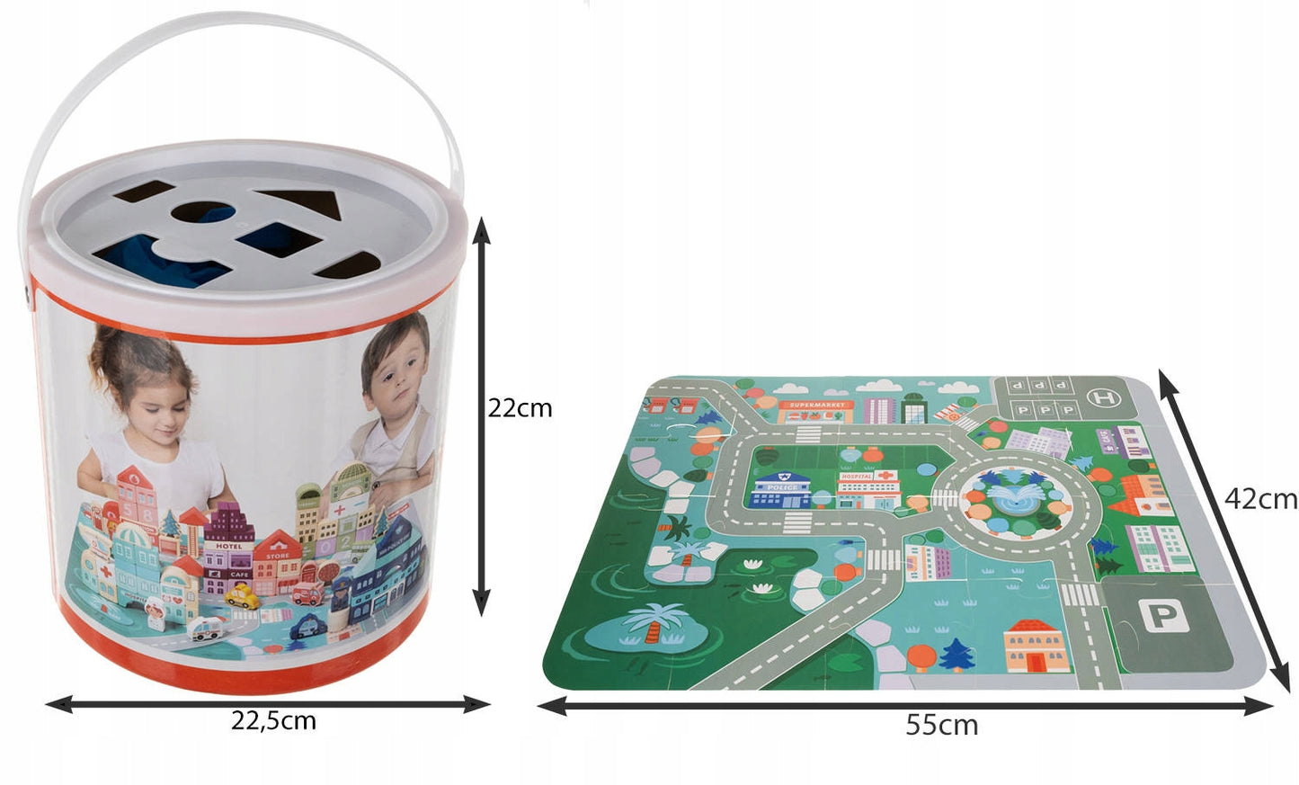 - SPECYFIKACJA – ilość klocków: 100; puzzle: 20; możliwość ułożenia budynków: bank, szkoła, kawiarnia, policja, szpital, straż pożarna, stacja paliw, hotel, wymiary maty: 55x42 cm ; wymiary wiaderka: szerokość/głębokość 22x22,5 cm; waga: 1,375 kg; waga w opakowaniu: 1,769kg.