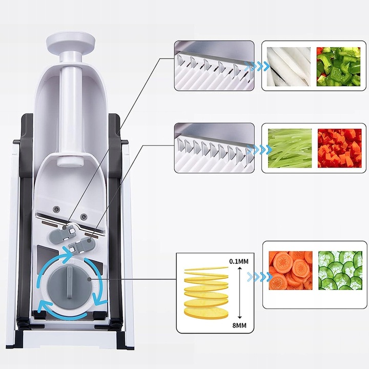 - Regulacja grubości cięcia: Dopasuj krojenie do swoich potrzeb – od cienkich plasterków po grubsze kawałki.