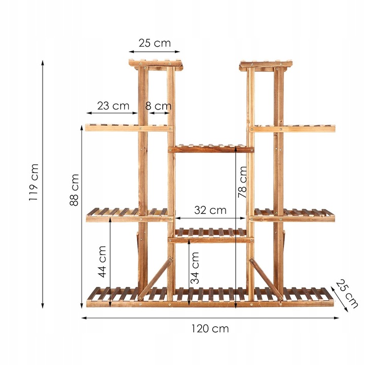 - Solidna Konstrukcja: Wykonany z wysokiej jakości drewna, stojak jest stabilny i wytrzymały, zapewniając bezpieczne podparcie dla roślin.