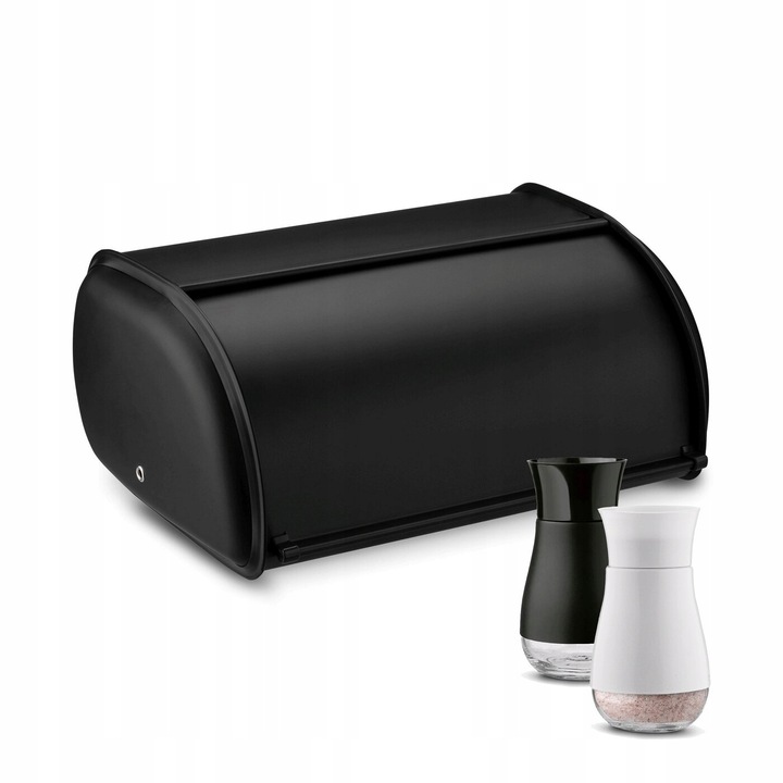 Kompaktowy Zestaw Kuchenny - Mały Chlebak Czarny Metalowy, Pojemnik, Solniczka i Pieprzniczka