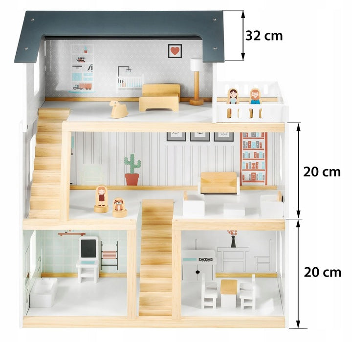 Pastelowy Drewniany Domek dla Lalek z Akcesoriami - 19 Elementów
